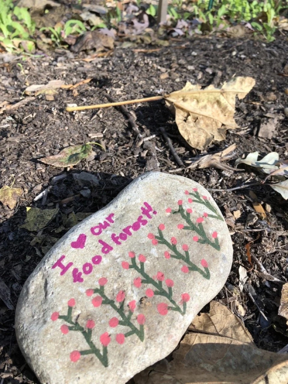 Mei Lin Khor, a Waldorf early education teacher, organized an amazing crafting session for all the children. They collected leaves and used them to make leaf prints on a large canvas banner that we’ll hang from one of the catalpa branches. They also made rock art and pinecone people and then decorated the food forest with them.