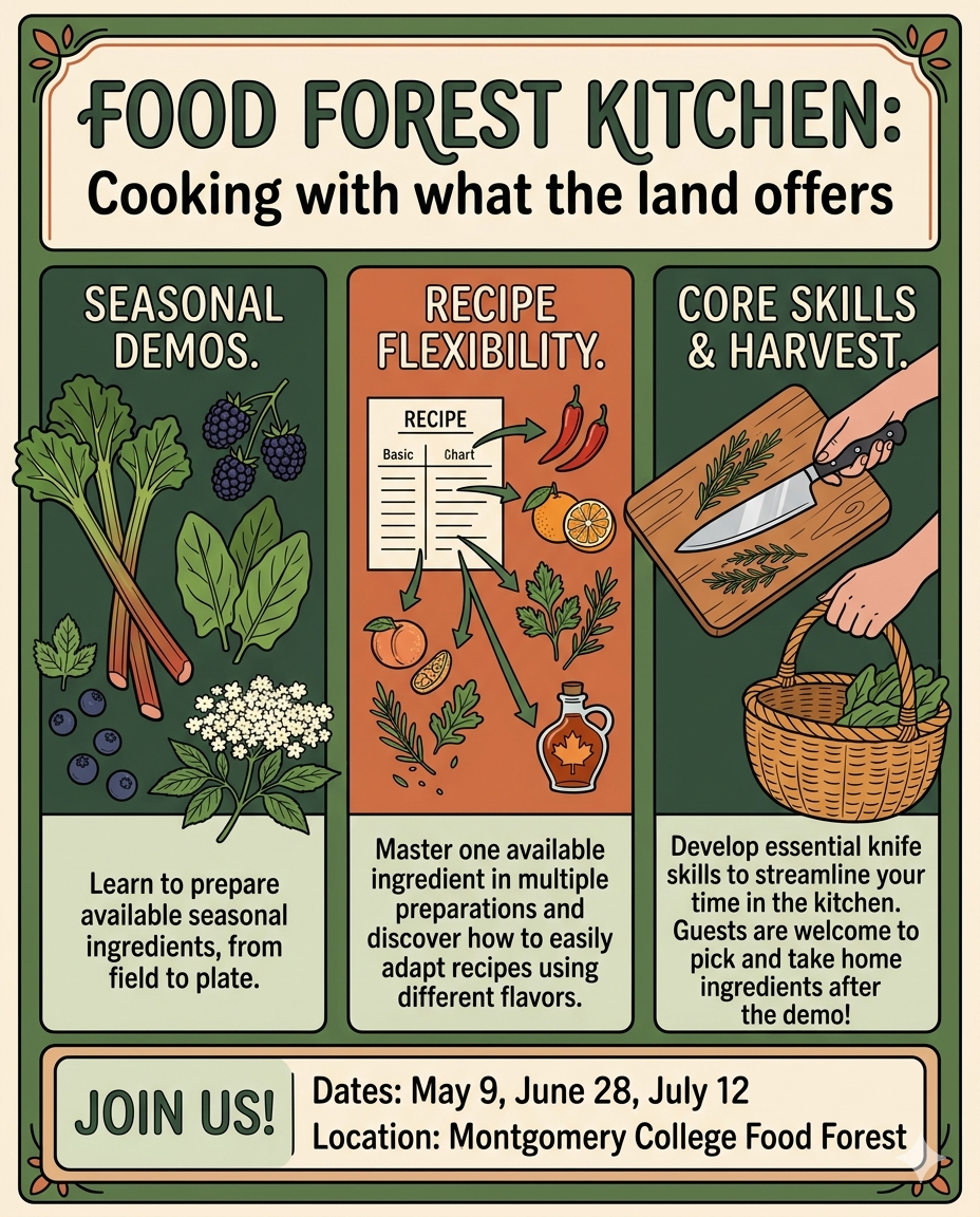 This series of cooking demonstrations will focus on how to adapt simple recipes to use seasonal ingredients from the food forest. For each demo, guest teacher Hannah Alday will showcase one ingredient sourced from the food forest in several different preparation methods and how you can adapt the recipes using different ingredients and flavors. She’ll also share basic knife skills to streamline your time in the kitchen. She will be using a fresh ingredient from the food forest, which all guests are welcome to pick and take home after the demo.